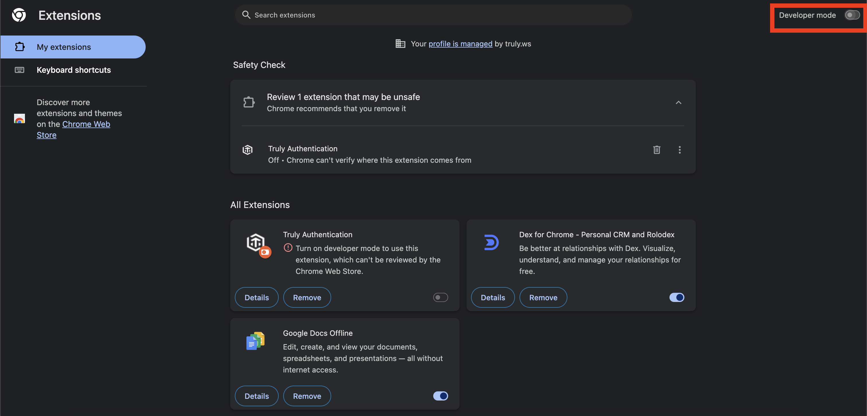 chrome://extensions/. - Find Truly Authentication.