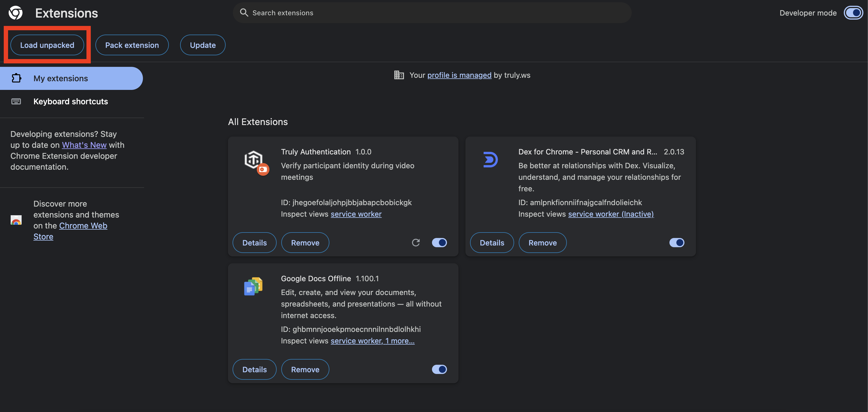 chrome://extensions/. - Enable Developer mode.