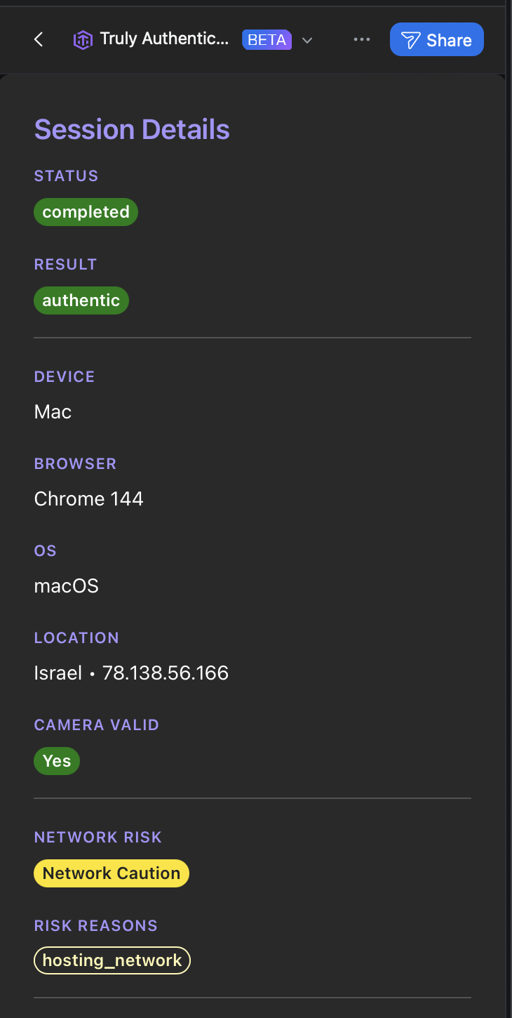 Use case: Confirm if a participant is authentic, suspicious, or requires additional review. Prerequisites:- The participant has completed the authentication flow from the link
